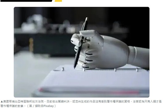 生成式AI近來蔚為風潮,技術快速迭代,大量的AI繪圖模型不斷問世,而這些生成式AI製造出的圖片,也引發許多版權的爭議討論。美國哥倫比亞特區聯邦地方法院,日前做出關鍵判決,認定AI並沒有受到著作權保護的資格,法官認為只有人類才是著作權保護的對象,並以過去猴子自拍的案例說明,猴子按下快門拍照,但該照片並未受到著作權保護,生成式AI生成的圖片也是如此。