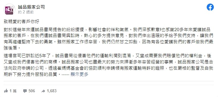 誠品搬家公司面臨鉅額求償,在臉書粉絲專頁喊話,店家近來在粉專指出,誠品書局不是第一間用「誠品」當公司名稱的店家,但過去以「誠品」為名的店家,也不會主張利益遭侵害,「因為大家多在各個領域認真的奮鬥,彼此協助相容」,批誠品集團沒有同理心,並呼籲誠品集團「停止這種形式的霸凌」!