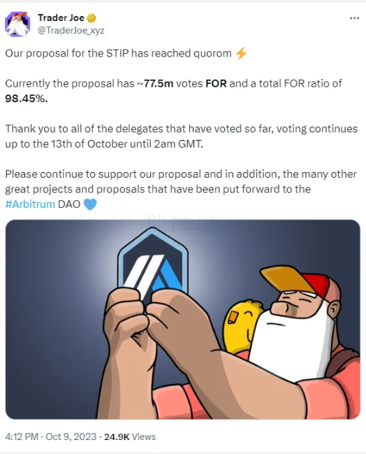 9 月 26 日,Trader Joe 在 Arbitrum 社區發布提案,向 Arbitrum DAO 財庫申請 183 萬枚 ARB 撥款,隨後,Trader Joe 將數量下調至 151 萬枚,這筆撥款用於提高現貨流動性和交易效率。目前,該提案的投票支持率為 98.45%。