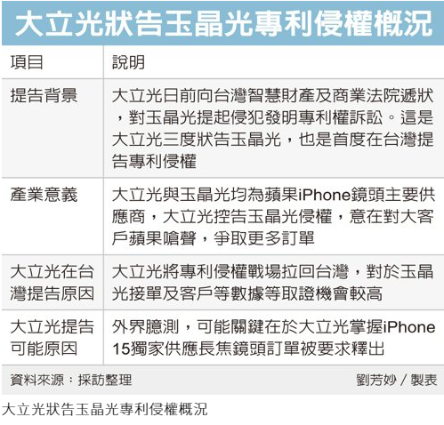 大立光2013年首度在美國狀告玉晶光侵權,最後在蘋果出面協調下,2016年雙方和解收場。時隔九年,去年8月再向中國廈門中級人民法院對玉晶光及子公司玉晶廈門提起侵犯專利權訴訟。