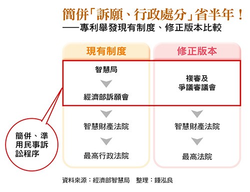 對此,智慧局去年提出《專利法》修法,將原智慧局行政處分及經濟部訴願簡併為「複審及爭議審議會」,以三或五人合議的審議程序決定;若不服,就準用民事訴訟程序到智財法院提起訴訟,最終進入最高法院,達到「三級三審」。