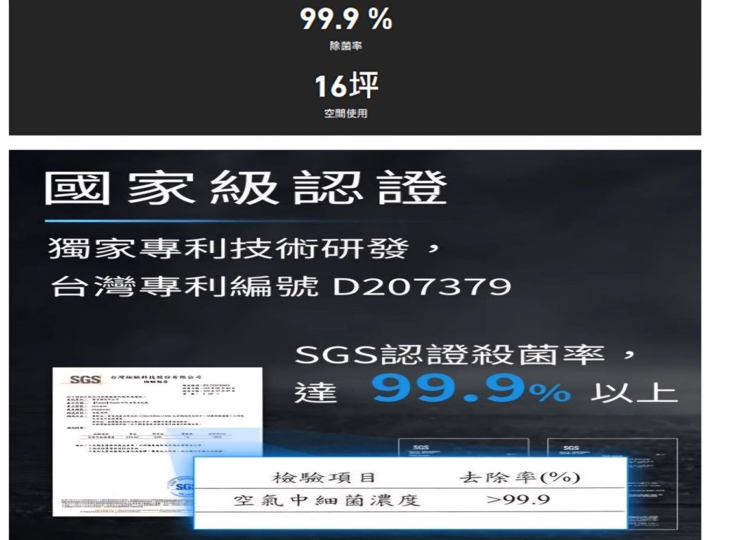 公平會表示,富奇賴股份有限公司銷售的「【Future】GC1光能清淨機」商品,在公司網站刊載「16坪空間使用」、「國家級認證」、「獨家專利技術研發,台灣專利編號D207379」、「SGS認證殺菌率,達99.9%以上」,下方輔以SGS檢驗報告。