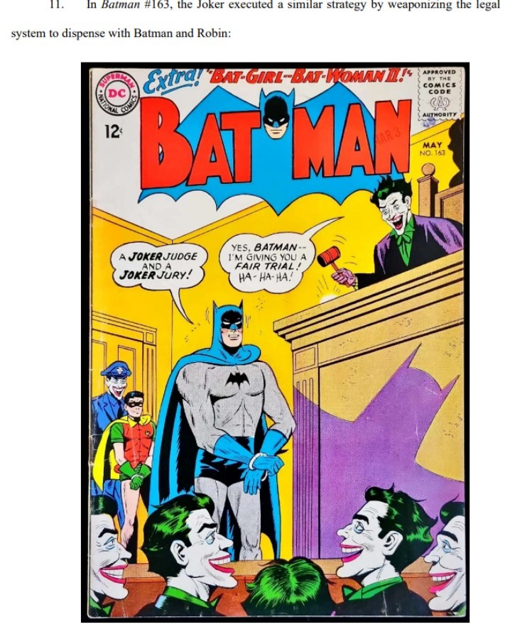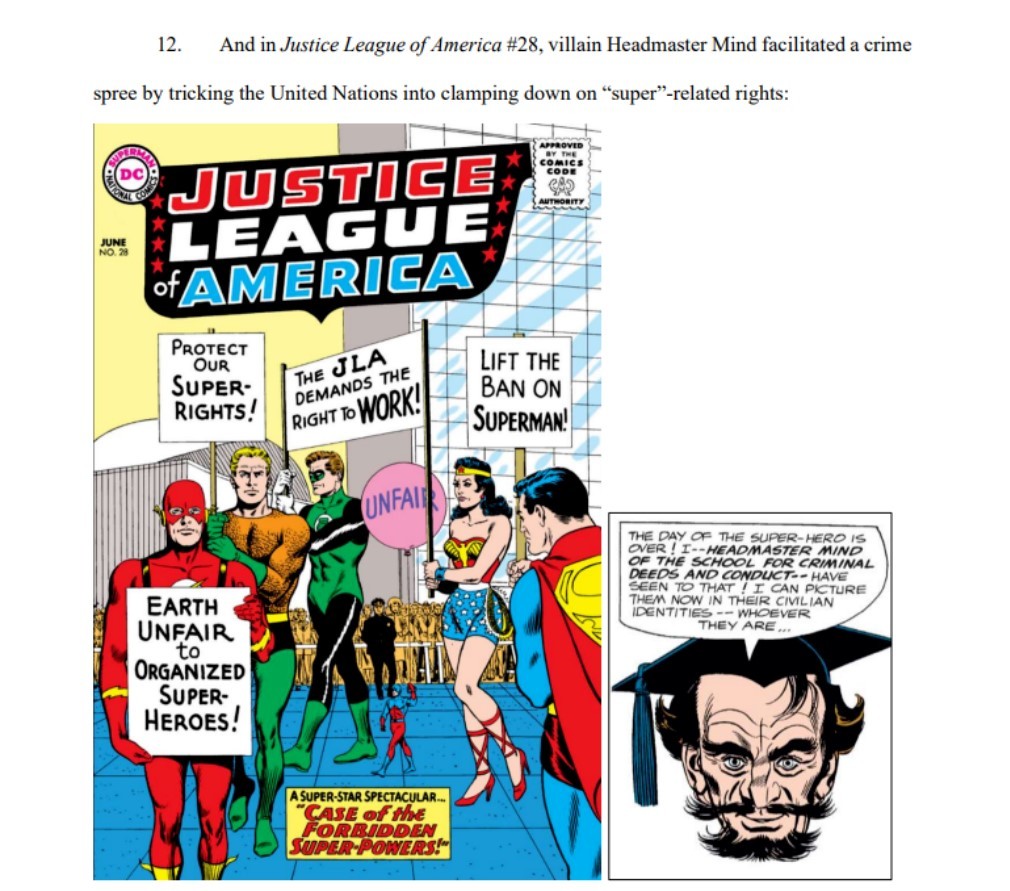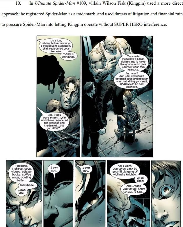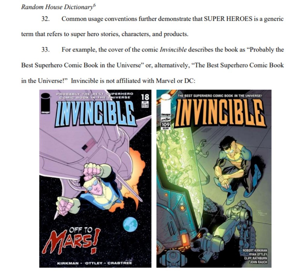 值得一提的是,這份法律文件是由一位漫畫迷所寫,他引用了Ryan North的《 Fantastic Four》、Brian Bendis與 Mark Bagley的《Ultimate Spider-Man》,以及白銀時期的《Batman》、《Justice League Of America》,甚至也以Image Comics的《無敵少俠》(Invincible)來佐證「超級英雄」是通用詞彙的證明。