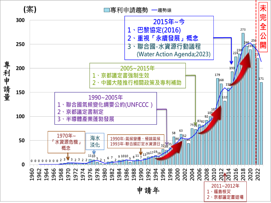 據報告指出,全球近60 年來,半導體產業「廢水回收及水資源再生」技術之專利申請量呈顯著上升後穩定發展之趨勢(參見圖 1),大致上可分為5個階段,分別為萌芽期階段(1970~1997年)、發展期階段(1997~2011年)、發展趨緩、略為衰退階段(2012~2014年)、復甦、再發展階段(2015~2018)及飽和、穩定發展階段(2019~2023 年)。