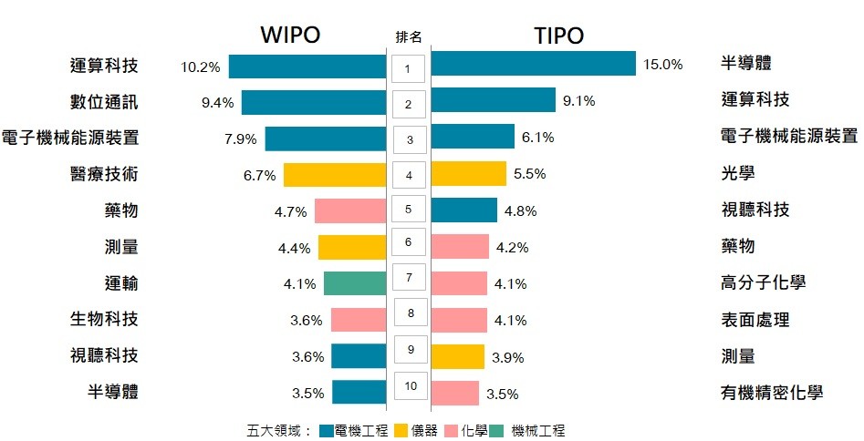 2023年,WIPO與TIPO發明專利申請,分別以「運算科技」及「半導體」最多