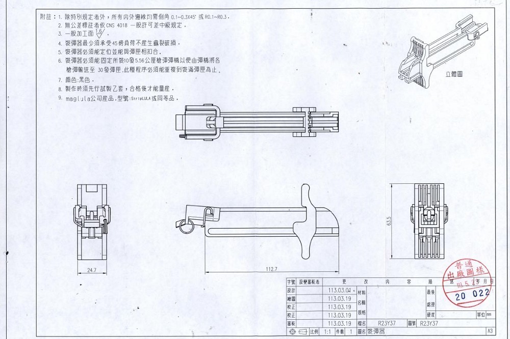 陸軍規劃採購8萬6114把T112(圖)戰鬥步槍,裝彈器規格藍圖,被以色列專門生產槍械配件maglula公司,質疑抄襲專利產品。(資料照片/張哲偉攝)