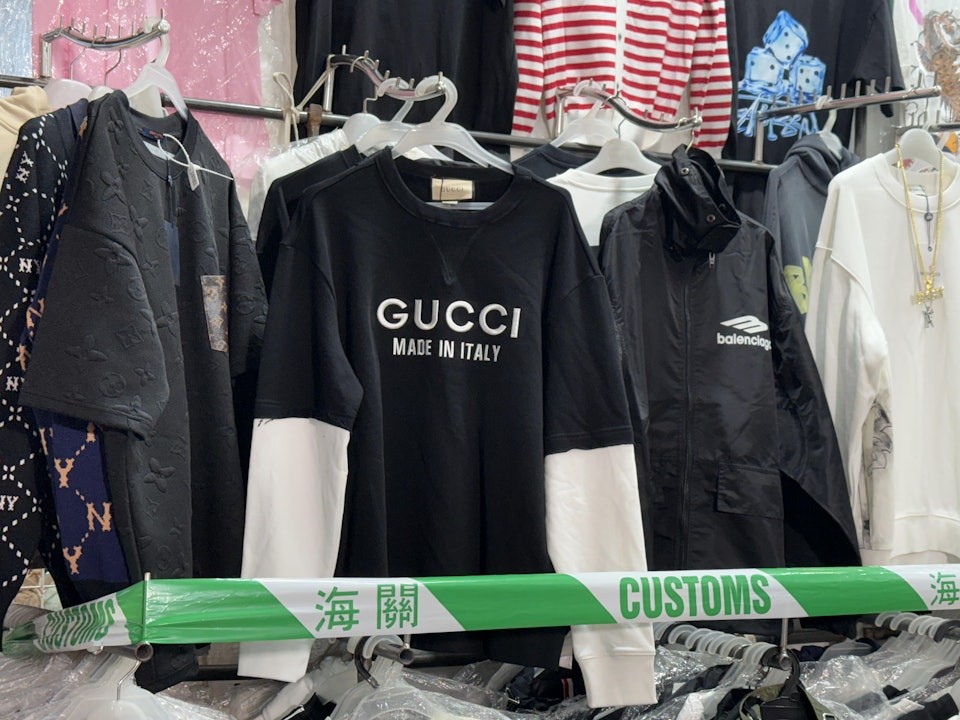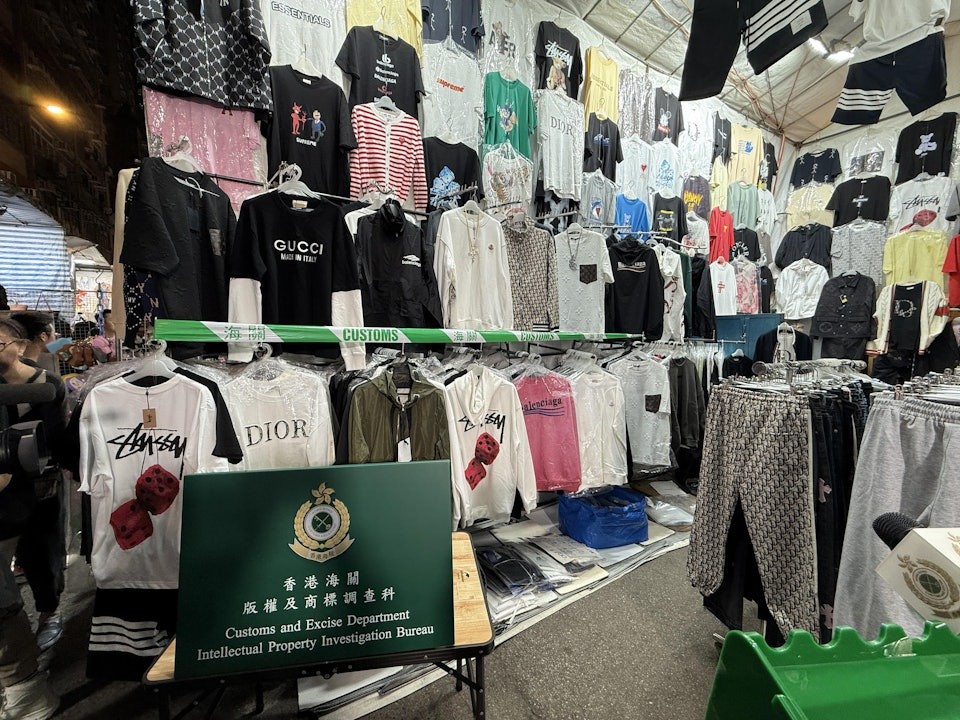 海關早前在巡查期間發現有小販攤檔售賣冒牌物品,經調查及在商標持有人協助下,於11月26日至12月11日展開代號「破陣」行動,突擊掃蕩27個位於旺角通菜街的小販攤檔,檢獲最少6,500件懷疑冒牌物品,包括服飾、手袋及手錶等,市值逾300萬港元。現場所見,檢獲部分的T恤印有Gucci及Dior商標。