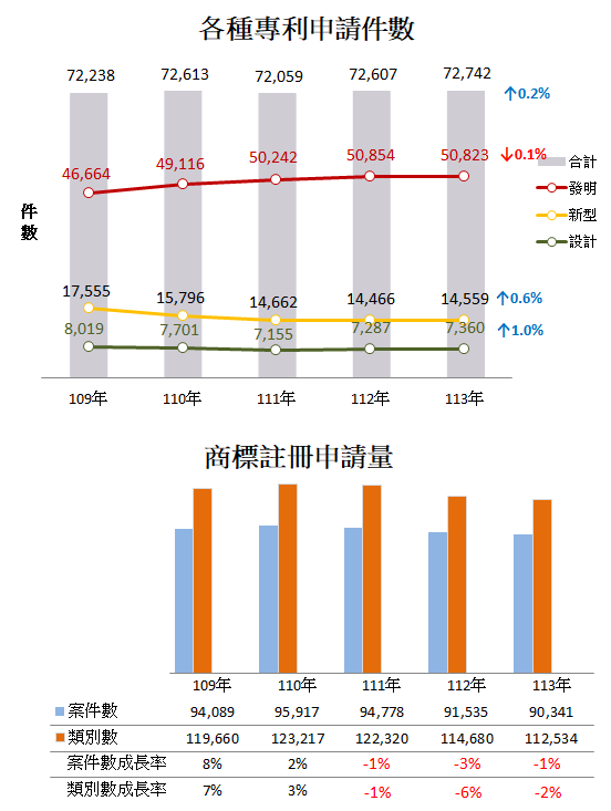 近3年智慧局受理三種專利申請件數穩健向上,113年來到72,742件,較112年大致持平。其中,發明專利(50,823件)較112年略減,呈現稍弱且仍維持相當動能;新型專利(14,559件)則反彈回升,設計專利(7,360件)持續上揚;商標註冊申請90,341件,減幅趨緩。另一方面,智慧局致力提升審查能量,113年發明專利平均首通期間為8.4個月,商標為6.1個月,各較112年減少0.5個月、0.1個月,協助企業儘早取得權利進行產業布局。