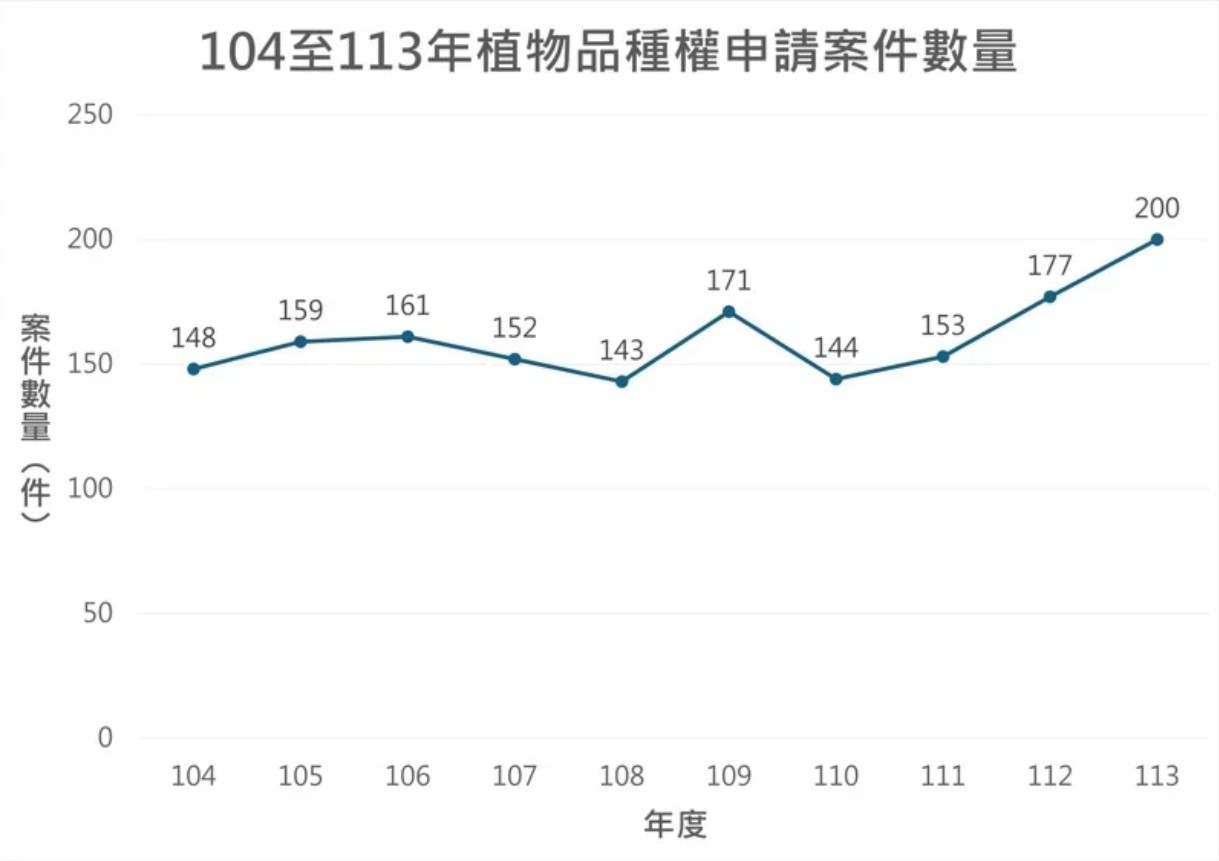 我國參酌國際植物新品種保護聯盟(UPOV)1991的公約修定「植物品種及種苗法」,自2005年6月30日施行至今,申請案件數穩定成長,2024年申請案件更達到200件,為近10年高峰,新品種在受理公開後即可取得臨時性保護,對於育種者多一分保障。