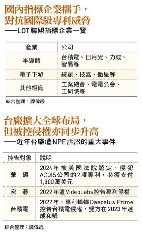 近年來,專利成為部分集團興訟索賠的武器,且狀況漸趨頻繁。專利訴訟的威脅,促使台灣兩大半導體巨頭與眾多科技業者,在工研院號召下成立防禦聯盟。