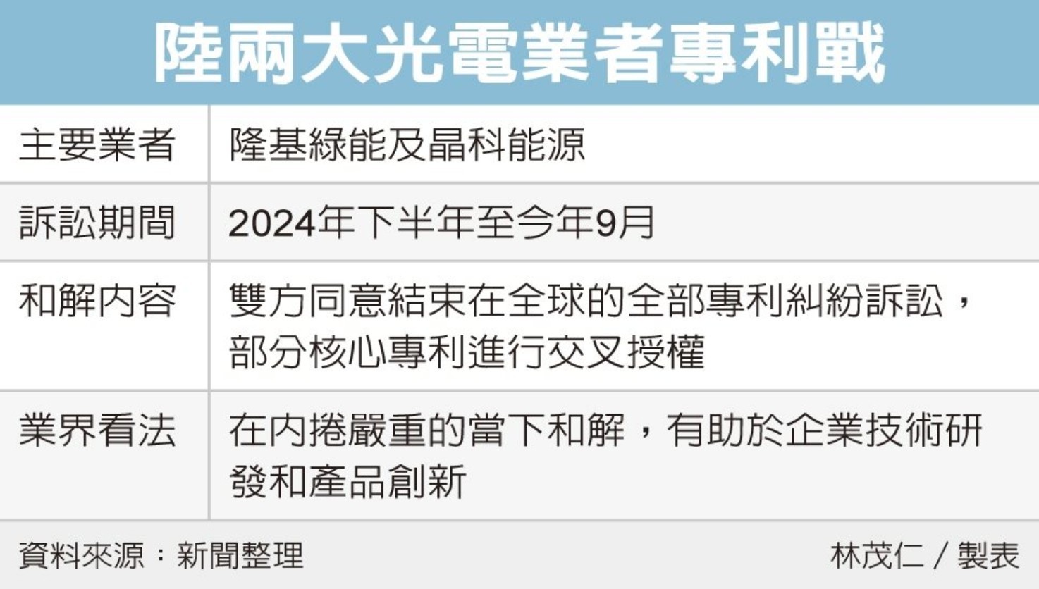 大陸兩大光電巨頭在今年初鬧得轟轟烈烈的專利戰,終於落下帷幕。隆基綠能與晶科能源,共同發布關於達成專利訴訟和解的聯合聲明,表示雙方同意結束在全球範圍內正在進行的全部專利糾紛法律程序,並就雙方各自持有的部分核心專利進行交叉授權。